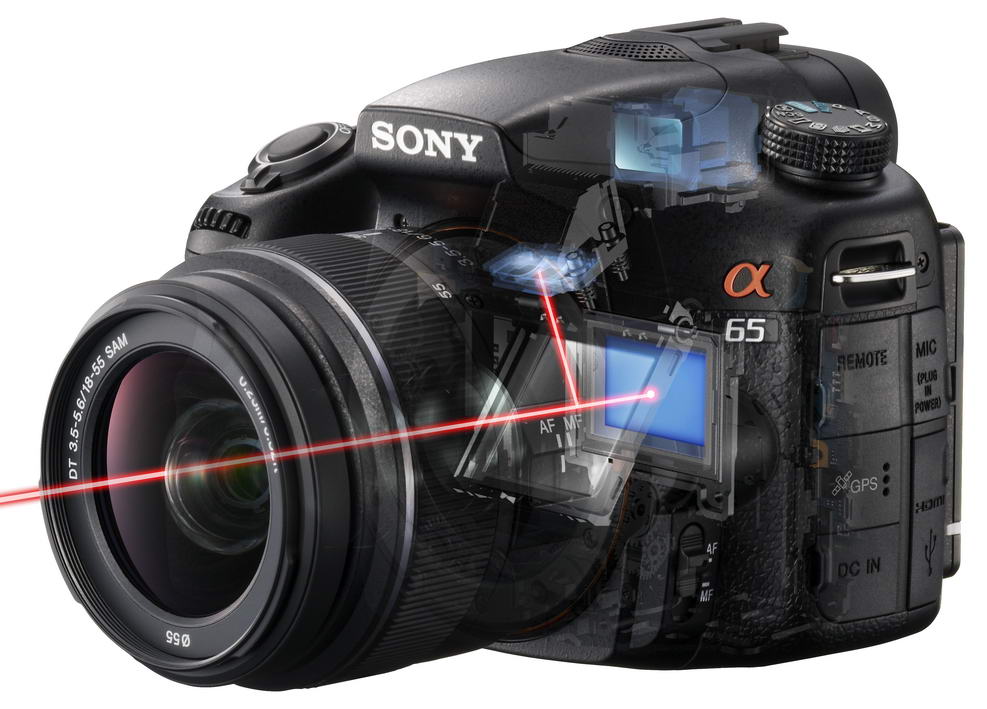 Was ist denn nun so besonders, an dieser Spiegelreflex? Es ist der Spiegel! Er ist fest - sprich, er klappt nicht nach oben, denn das muss er nicht, weil er teiltransparent ist! Das gab es übrigens zu analogen Zeiten bereits schon einmal....